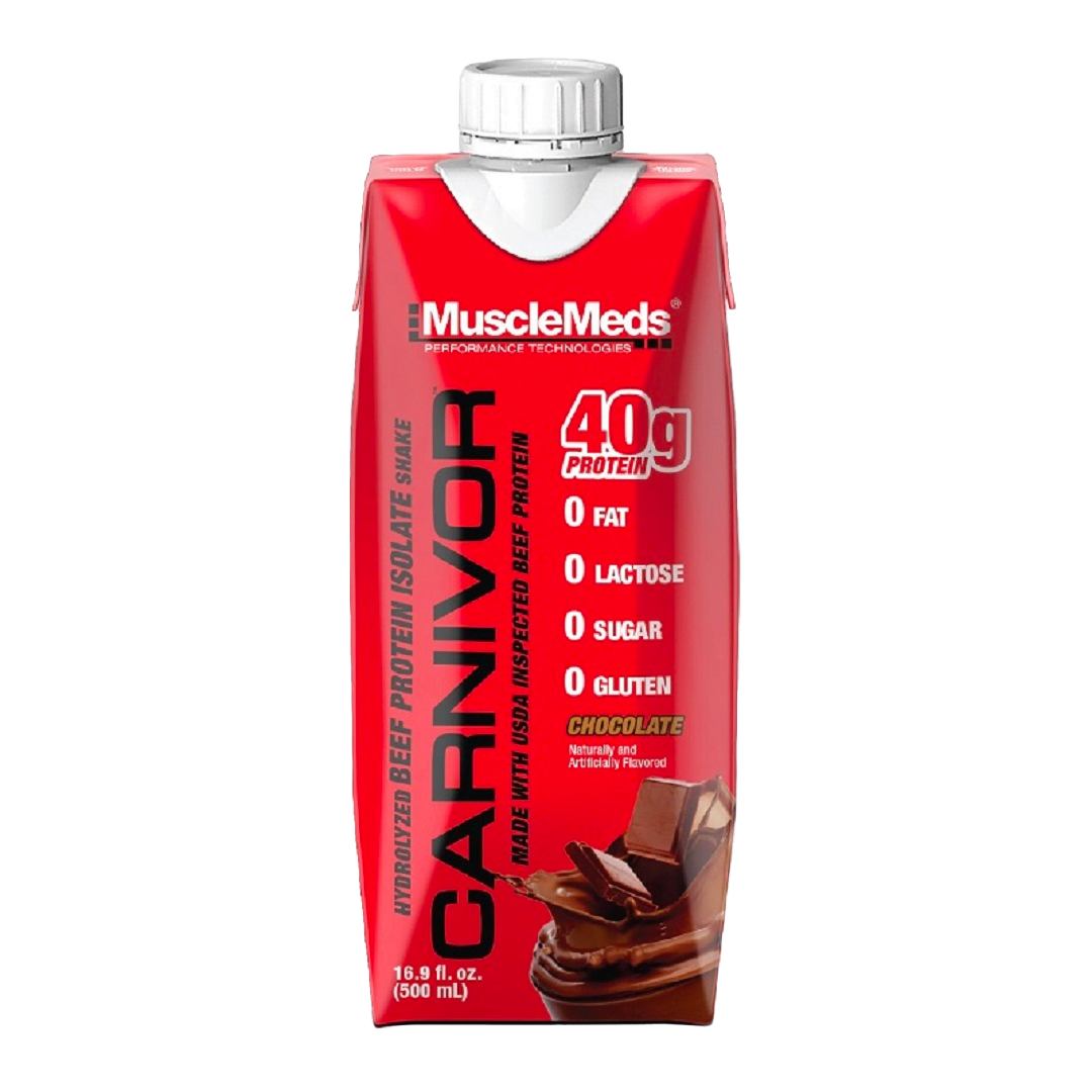 Carnivor RTD – Ready To Drink de la marca MuscleMeds es una bebida lista para ser tomada hecha a base de proteína de carne de res aislada e hidrolizada de alta concentración. Cada Frasco de 16.9 onzas o 500 mililitros aporta 40 gramos de proteína de rápida absorción y solo 2 gramos de carbohidratos sin adherir azúcar, grasa, lactosa, ni gluten a su fórmula. Ideal para transportar y consumir en cualquier momento del día.