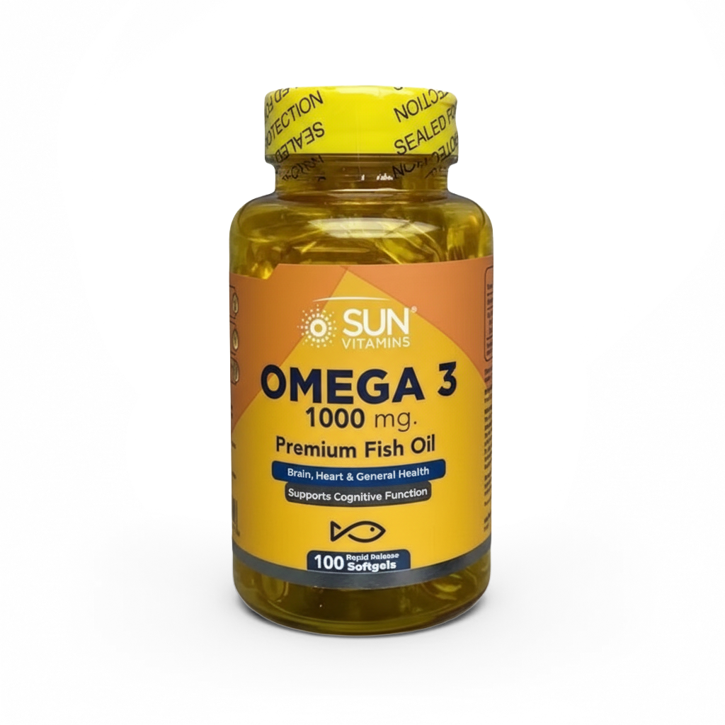 Sun Omega 3 es un suplemento alimenticio formulado para complementar la dieta diaria con ácidos grasos esenciales Omega 3. Cada softgel contiene 1000 mg de aceite de pescado, una fuente natural de EPA y DHA, componentes comúnmente utilizados en rutinas de bienestar y nutrición.